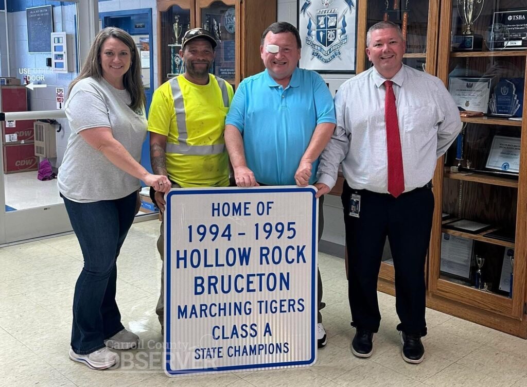 On Thursday morning, September 18, Hollow Rock Director of Public Works Branon Phillips surprised Band Director Keith Breeden with the original highway sign that once stood at the edge of town, honoring the band’s 1994-95 Class A State Championship.