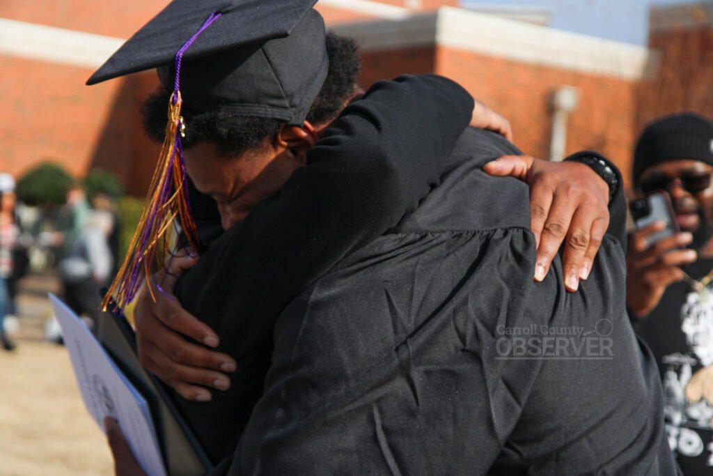 WARM EMBRACE – Tyrell Partee of Memphis hugs his mom after graduation. Jesse Joseph/Carroll County Observer