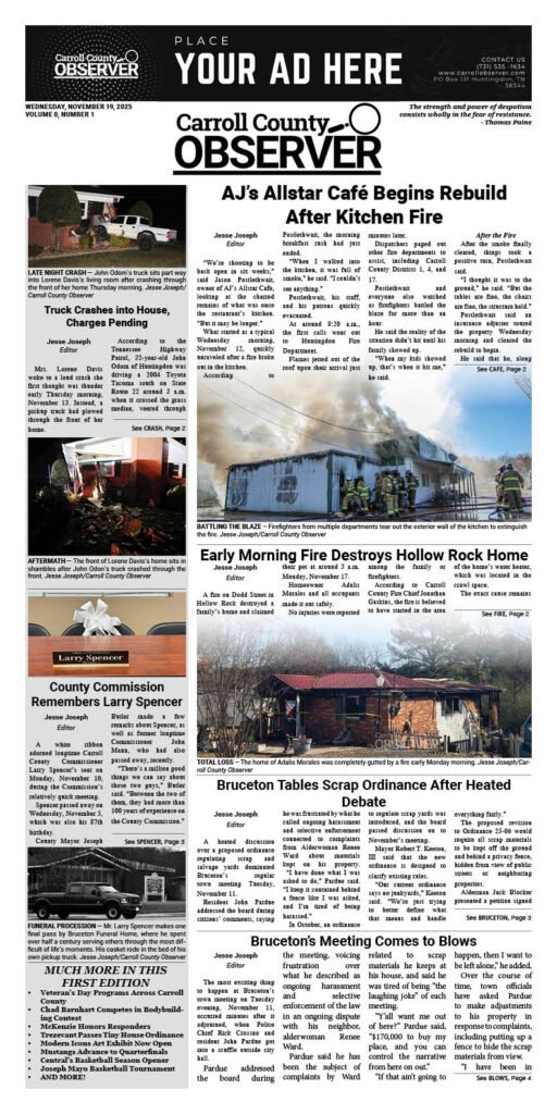 It includes Bruceton’s contentious town meeting, a Hollow Rock house fire, an early morning crash on Highway 22 crash, and AJ’s Allstar Café beginning its rebuild.