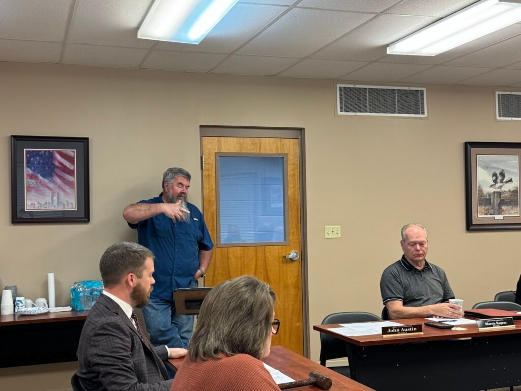 SHERIFF’S RESPONSE — Sheriff Andy Dickson (standing) makes his case for letting his department bank holidays. Jesse Joseph/Carroll County Observer