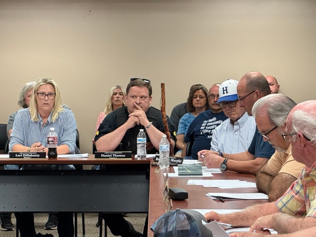 DEDUCTION CONCERNS — Commissioner Daniel Thomas (center) worried about an entire month’s worth of benefit deductions taken out of a single check for employees. Jesse Joseph/Carroll County Observer