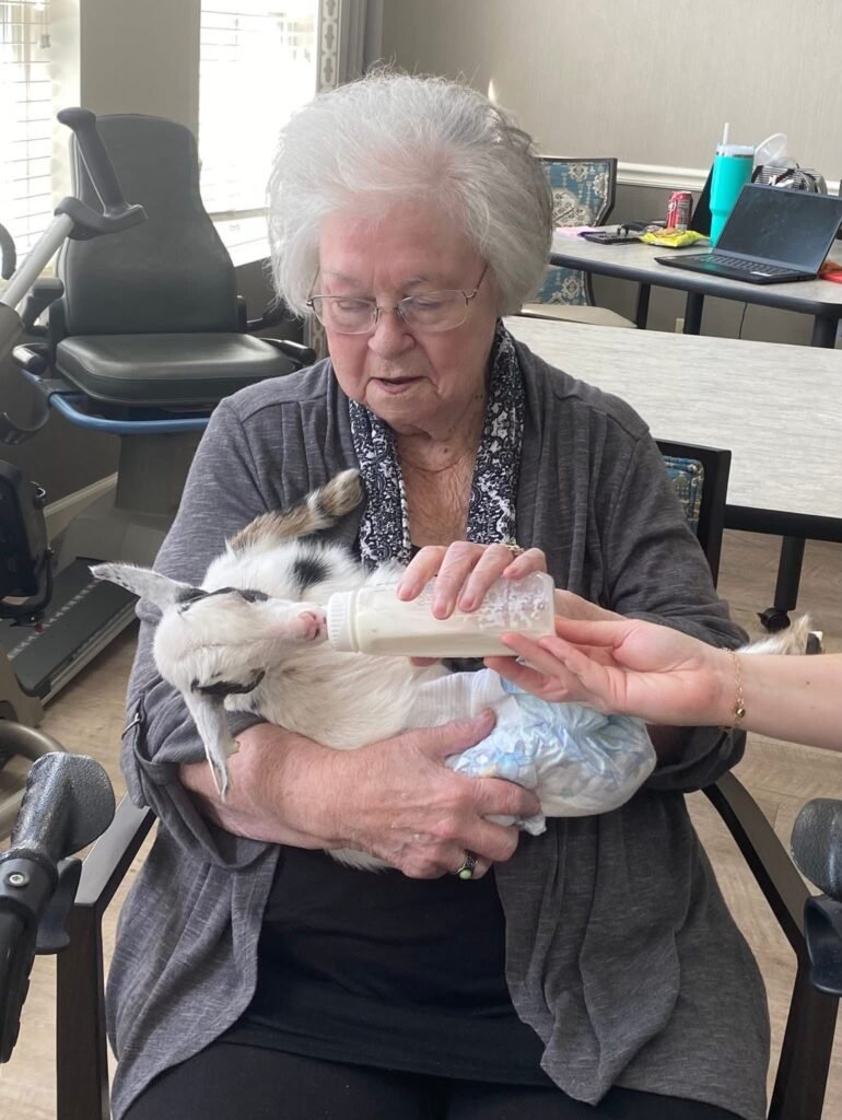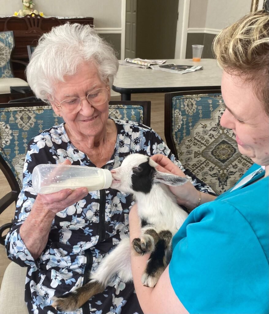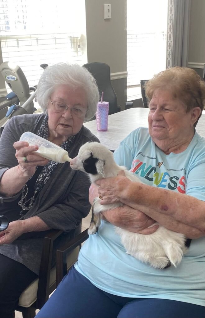 In celebration of St. Patrick’s Day, our residents enjoyed a chef-prepared traditional Irish meal of corned beef and cabbage, which was a big hit. Adding to the excitement this month, our Health and Wellness Director, Kati, arranged a visit from adorable baby goats. Residents had the opportunity to bottle-feed and play with them, creating smiles all around.