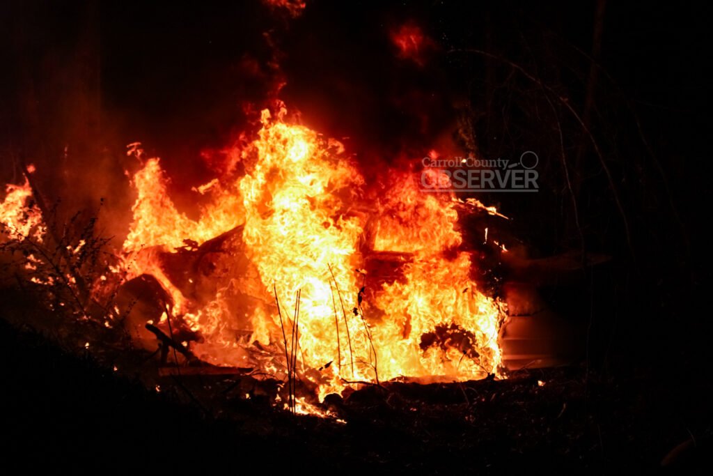FULLY ENGULFED – Fire had totally engulfed the vehicle when authorities and responders arrived. Jesse Joseph/Carroll County Observer