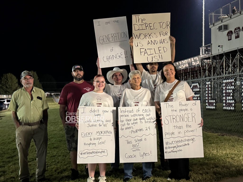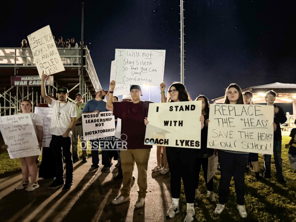 PROTEST SIGNS HELD HIGH – A group of parents and students gather at the entrance of the West Carroll football stadium Friday night, holding homemade signs during a protest over the termination of Bernard Lykes. Jesse Joseph/Carroll County Observer