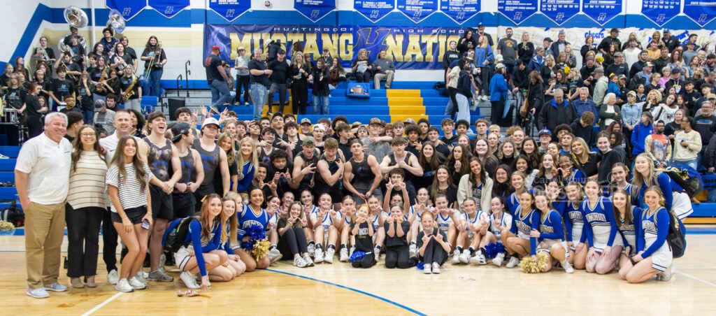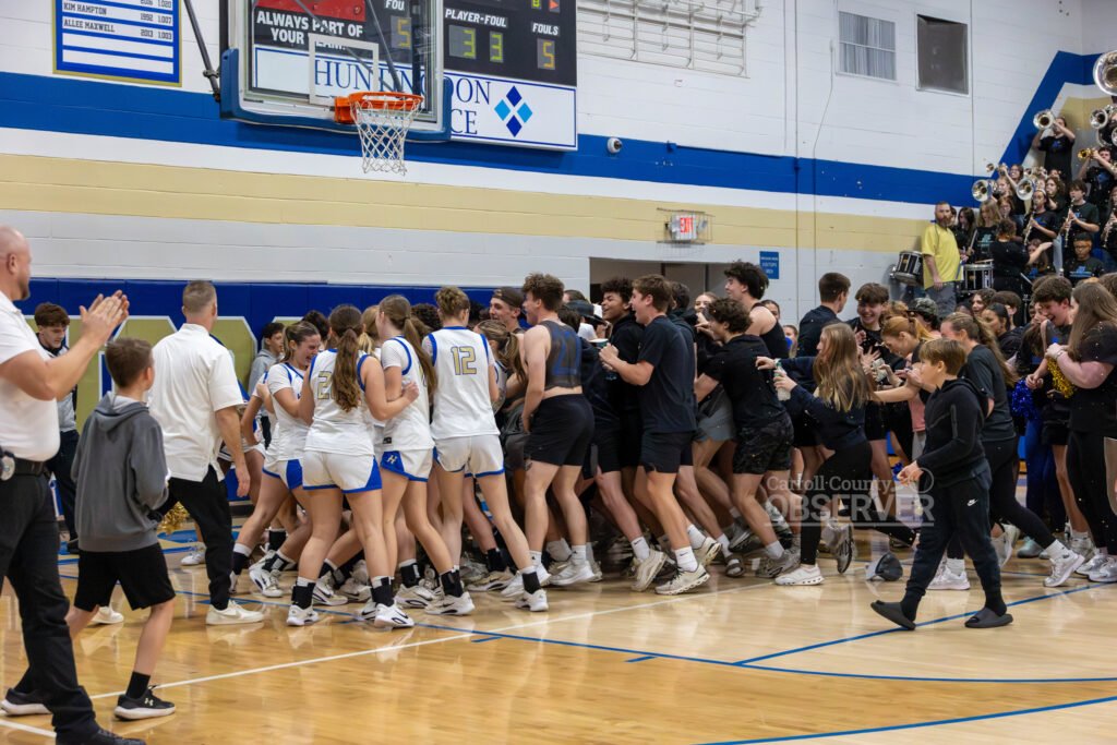 POST GAME CELEBRATION — The Huntingdon Fillies basketball teams celebrate with student section after sectional win to advance to state. Russell Bush/Huntingdon Sports Pics