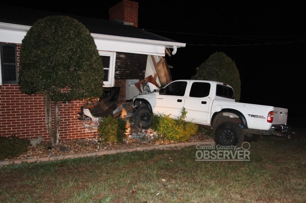 LATE NIGHT CRASH — John Odom’s truck sits part way into Lorene Davis’s living room after crashing through the front of her home Thursday morning. Jesse Joseph/Carroll County Observer