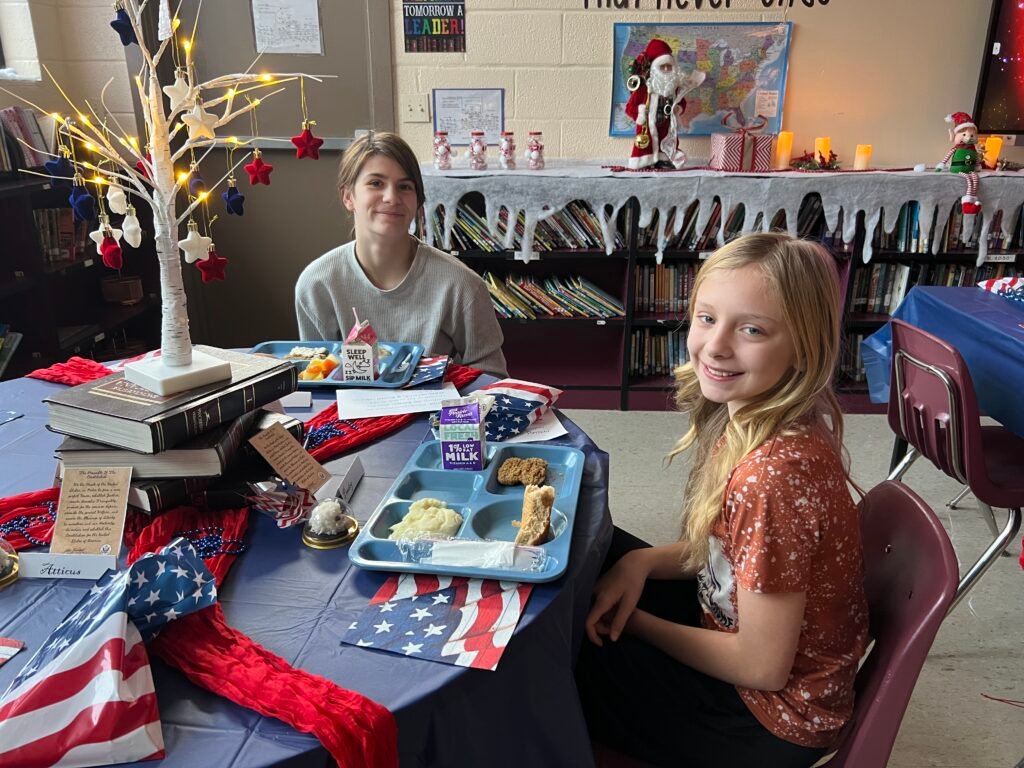 During the event, students enjoyed their meal in the library and received several commemorative items, including an eagle dessert, a copy of the Preamble to the Constitution, a lapel pin, an American flag, and a Christmas ornament to remember the occasion.