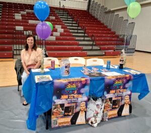 Tracy Halford. 1st Baptist Church of Trezvant, poses with her decorated booth, ready to tell everyone about their fundraiser, a Spaghetti Dinner and Silent Auction benefitting the Jesus Jam concert.